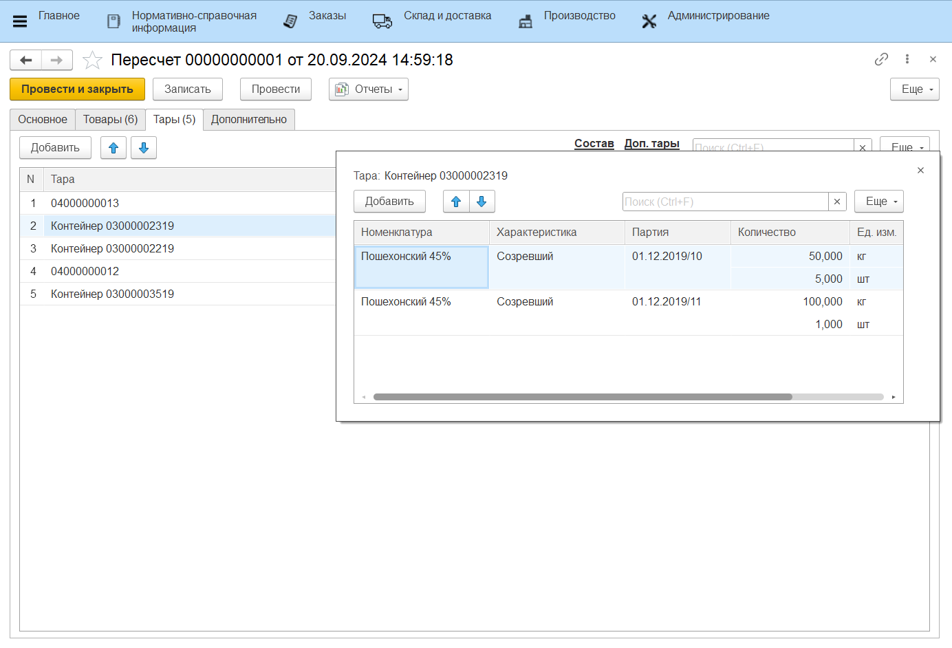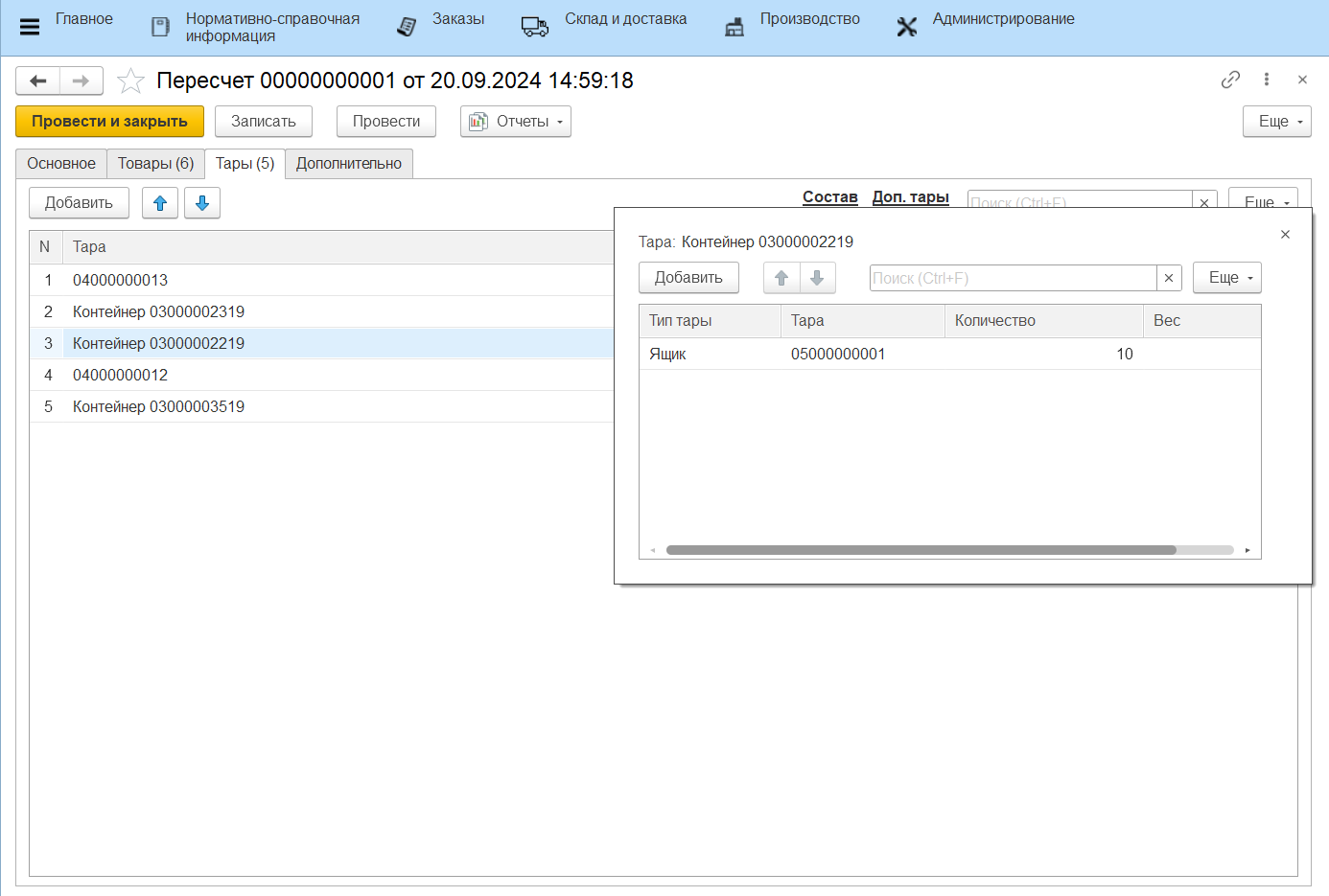По гипессылке "Состав" можно указать продукцию, находящуюся на выбранной таре, а также ее количество.
