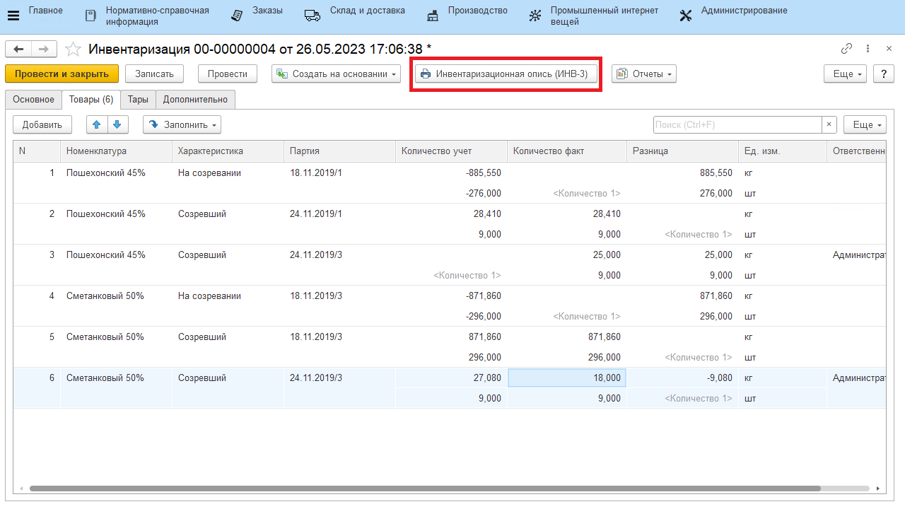 Для документа "Инвентаризация" используется печатная форма: "Инвентаризационная опись (ИНВ-3)"