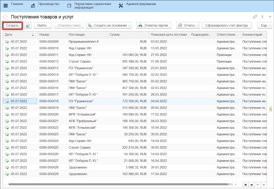 В подсистеме "Производство" в разделе "Приемка сырья" выбираем "Поступления товаров и услуг":