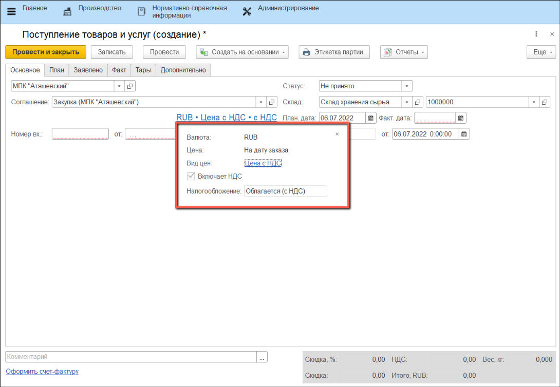 Поля "Валюта", "Цена", "Вид цен", "Налогообложение" и параметр "Включает НДС" заполняются автоматически согласно настройкам параметров учета или данным соглашения с поставщиком.