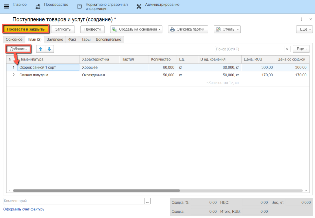 - Чтобы добавить новую номенклатуру, которую планируем принять, нажимаем кнопку "Добавить", в табличной части появится строка для заполнения;