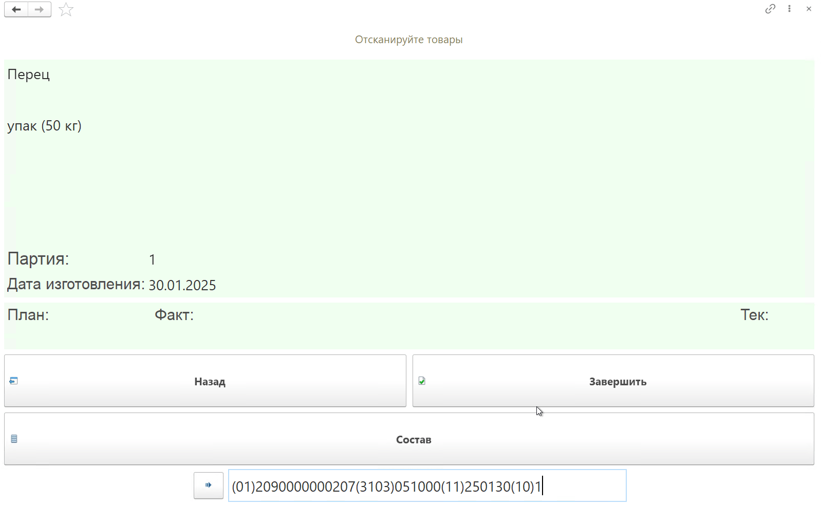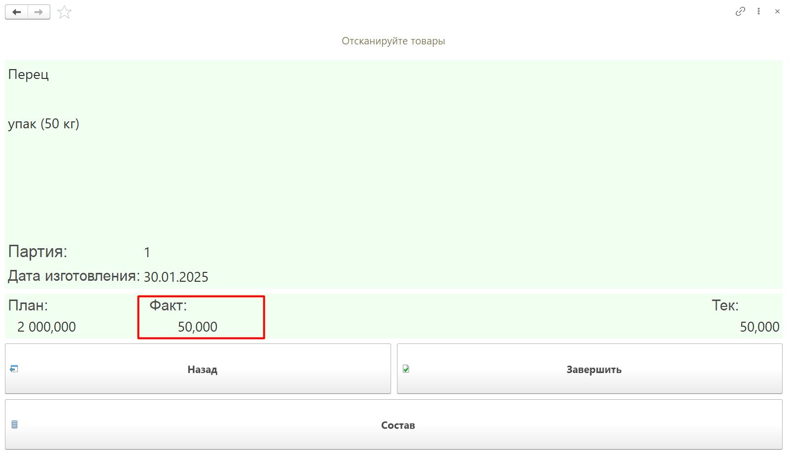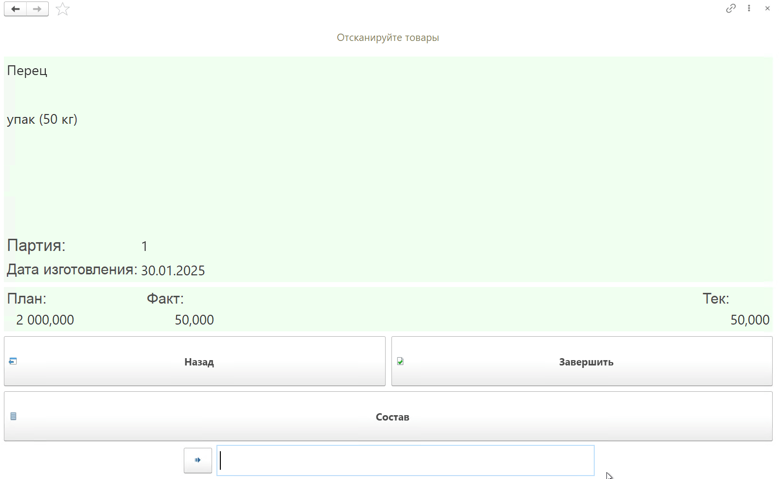 Автоматически существится переход на форму сканирования. При этом вес отсканированной ранее упаковки уже будет засчитан в качестве факта сканирования: