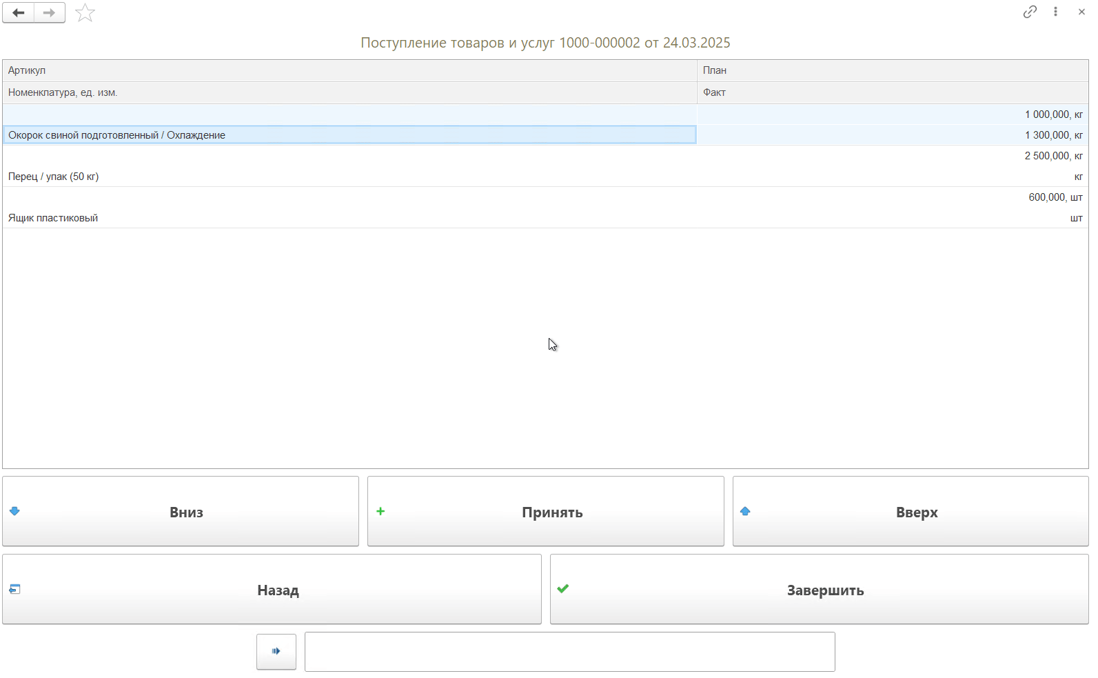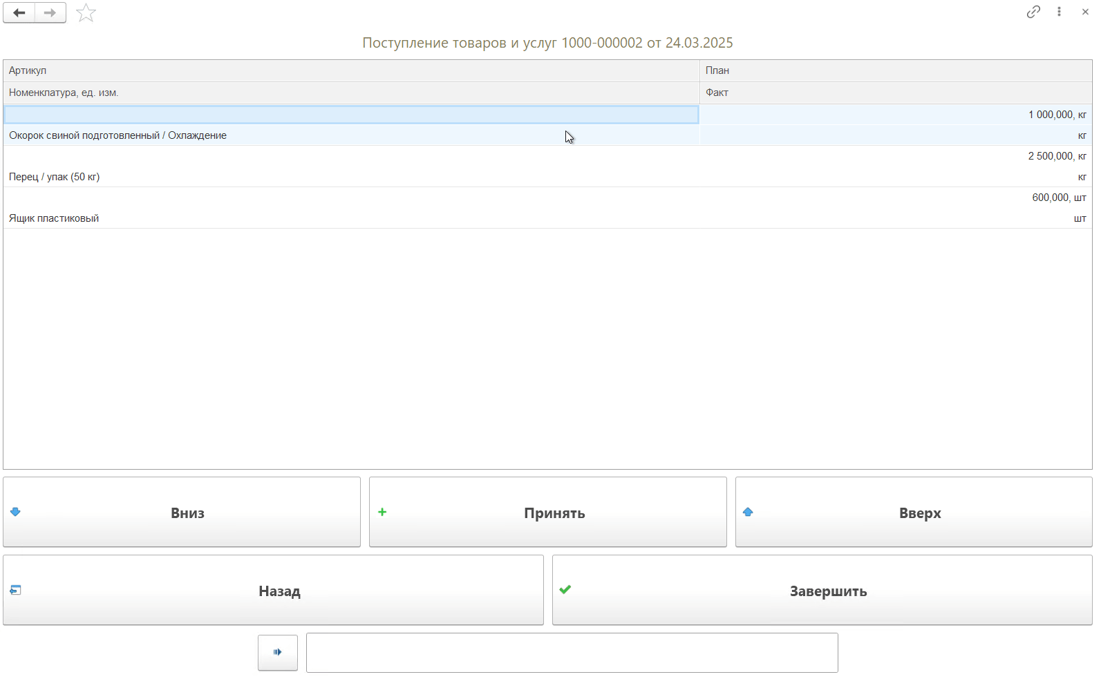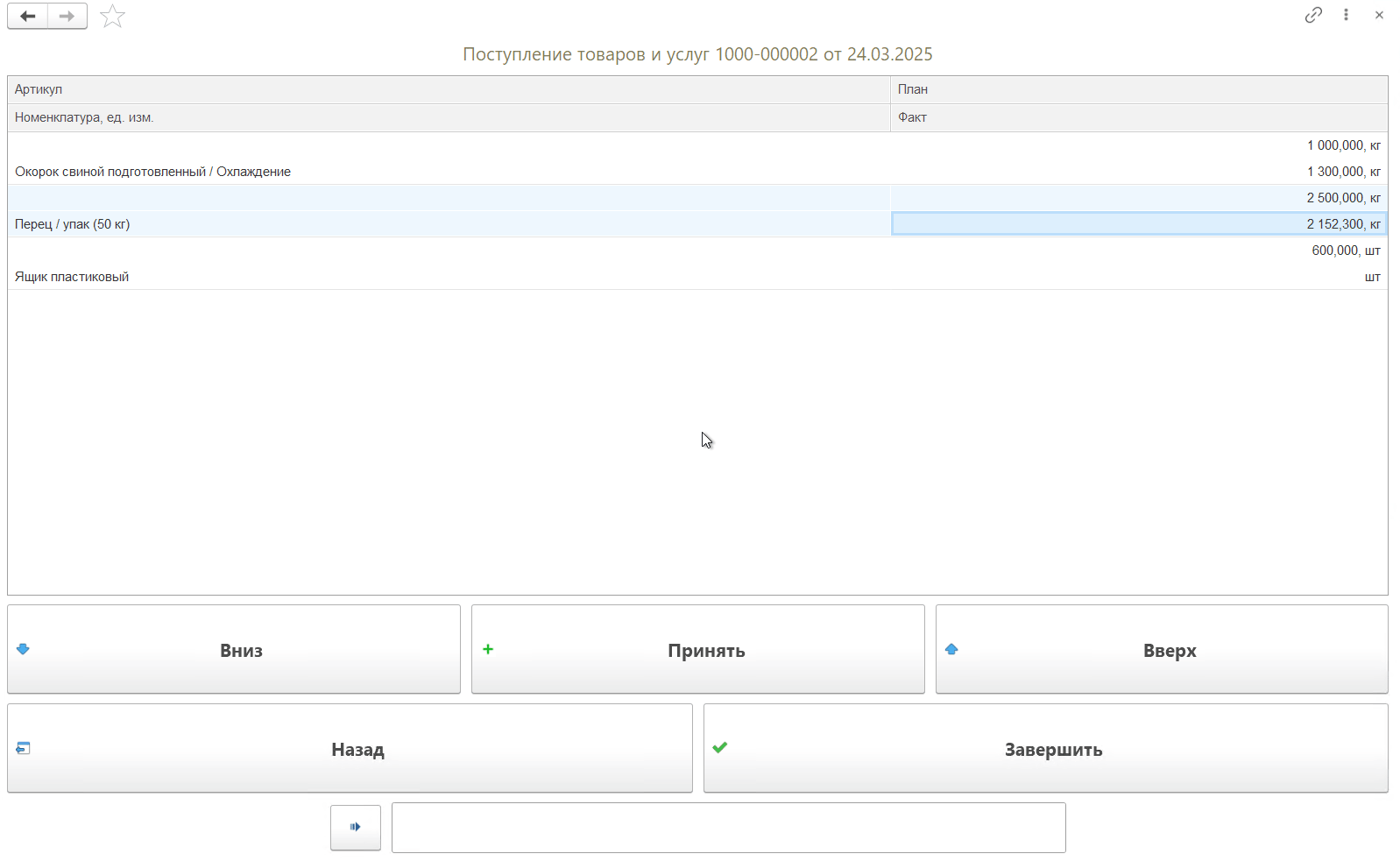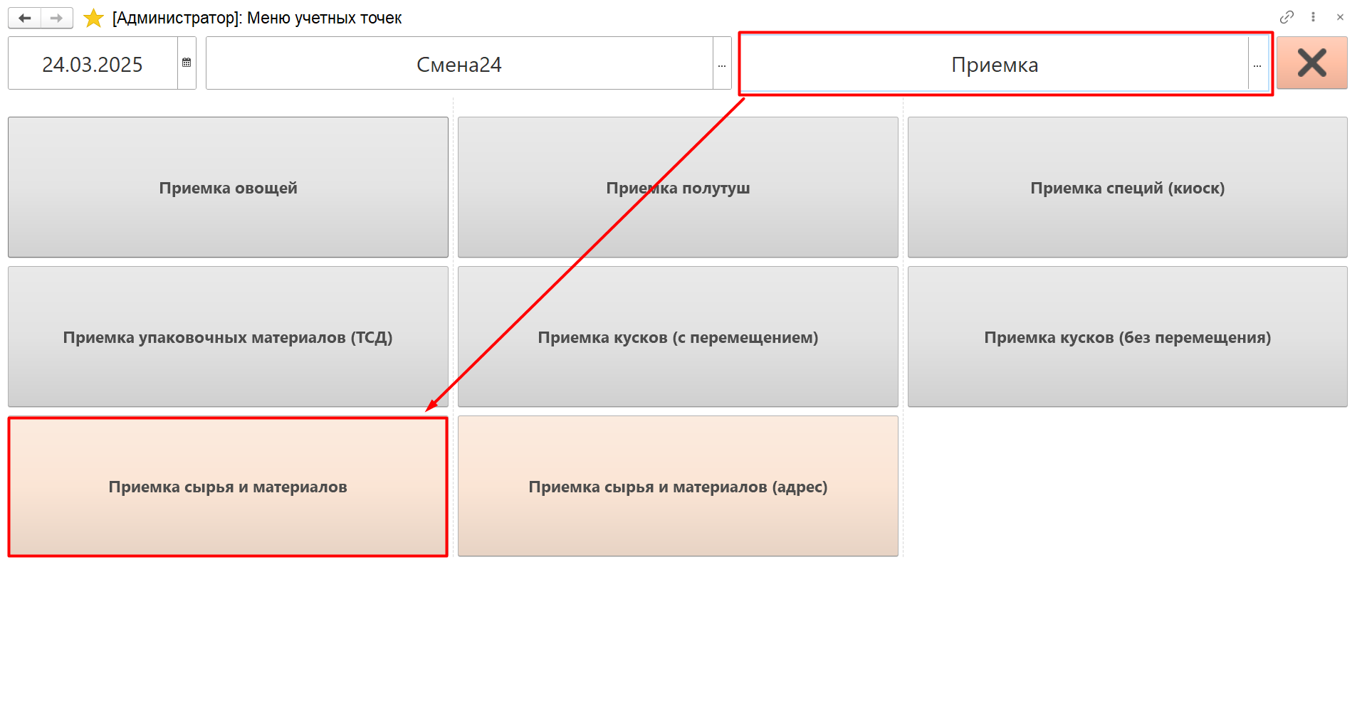 - Затем нажать кнопку "Приемка" для перехода к приемке сырья: