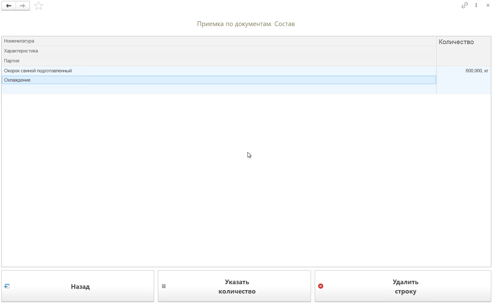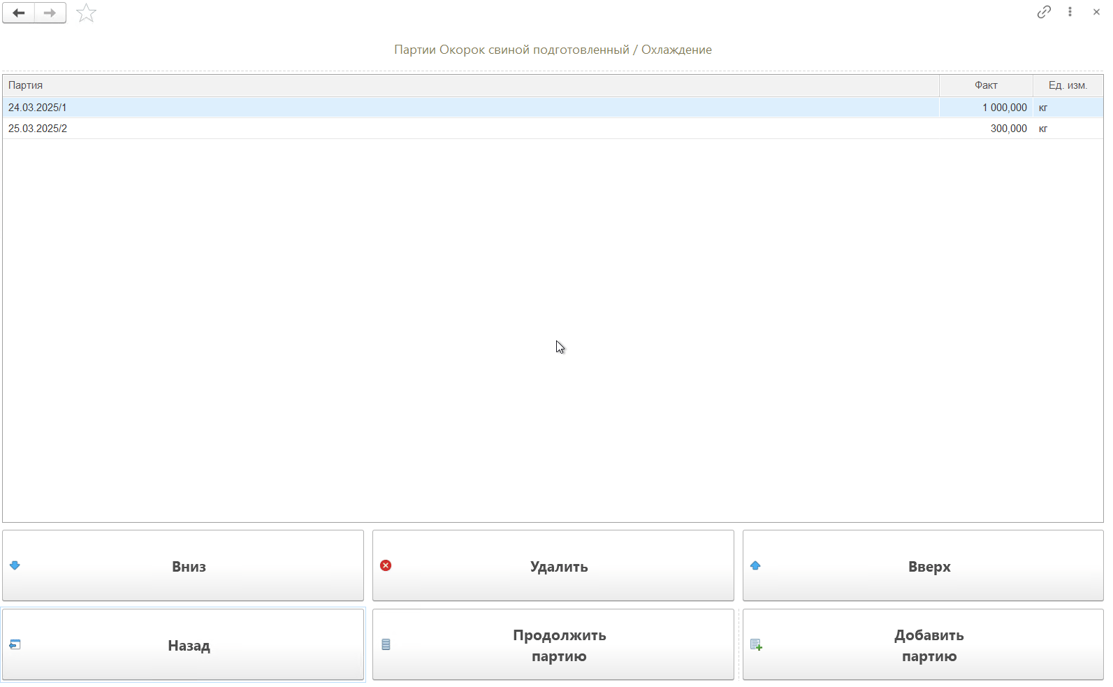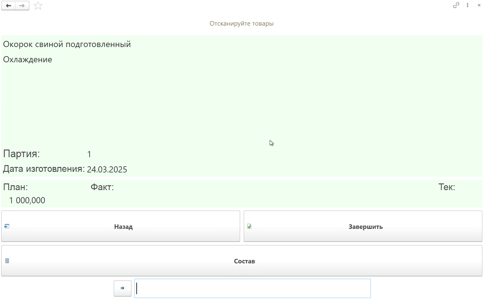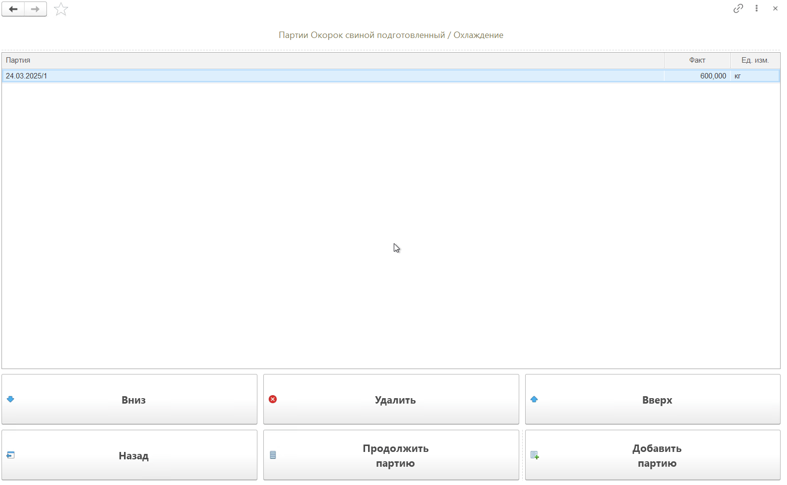 Для того, чтобы начать приемку другой партии этой же номенклатуры, нужно нажать кнопку "Добавить партию", тогда пользователь будет перенаправлен на форму ввода (или сканирования) заявленных показателей и затем на приемку.