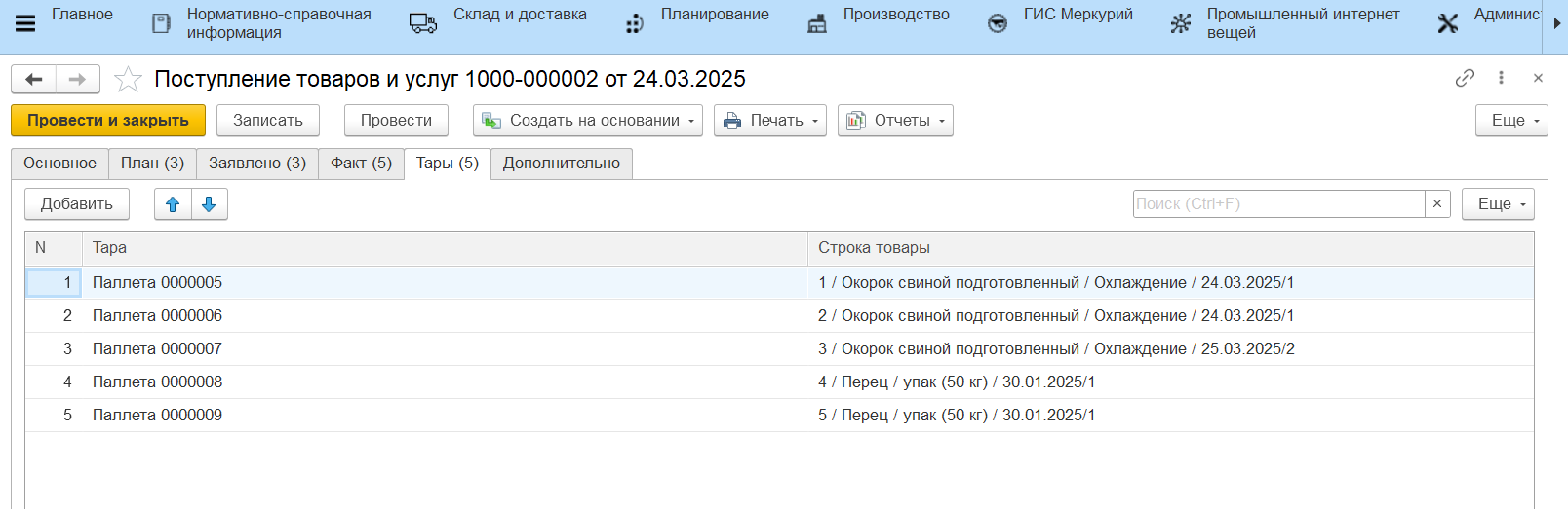 Строки товаров на странице "Факт" разбиваются в соответствии с принятыми паллетами на странице "Тары":