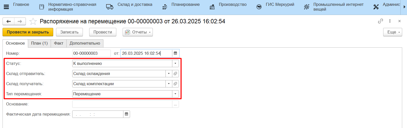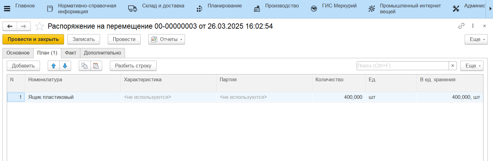 В настройках учетной точки было включено формирование перемещения, поэтому дополнительно на каждую принятую позицию было сформировано "Распоряжение на перемещение" с типом "Перемещение":