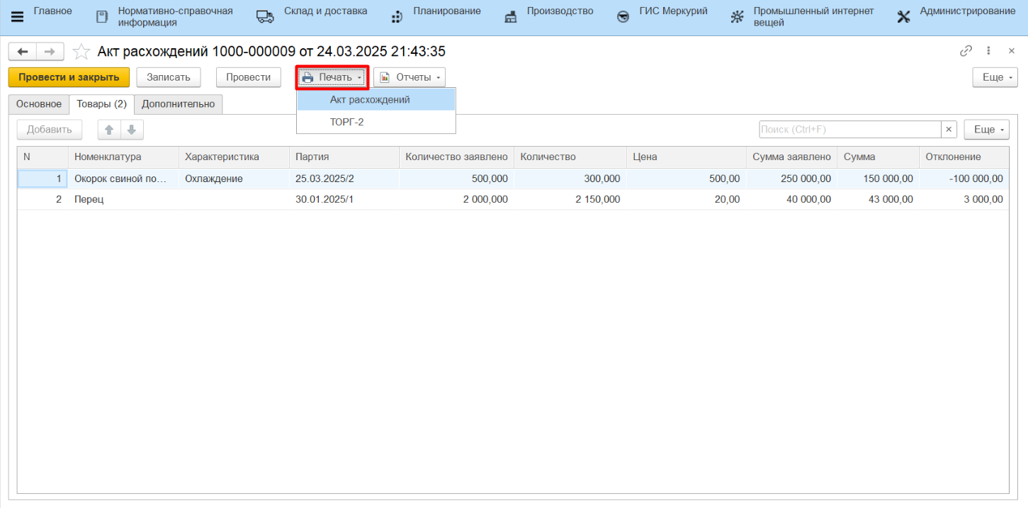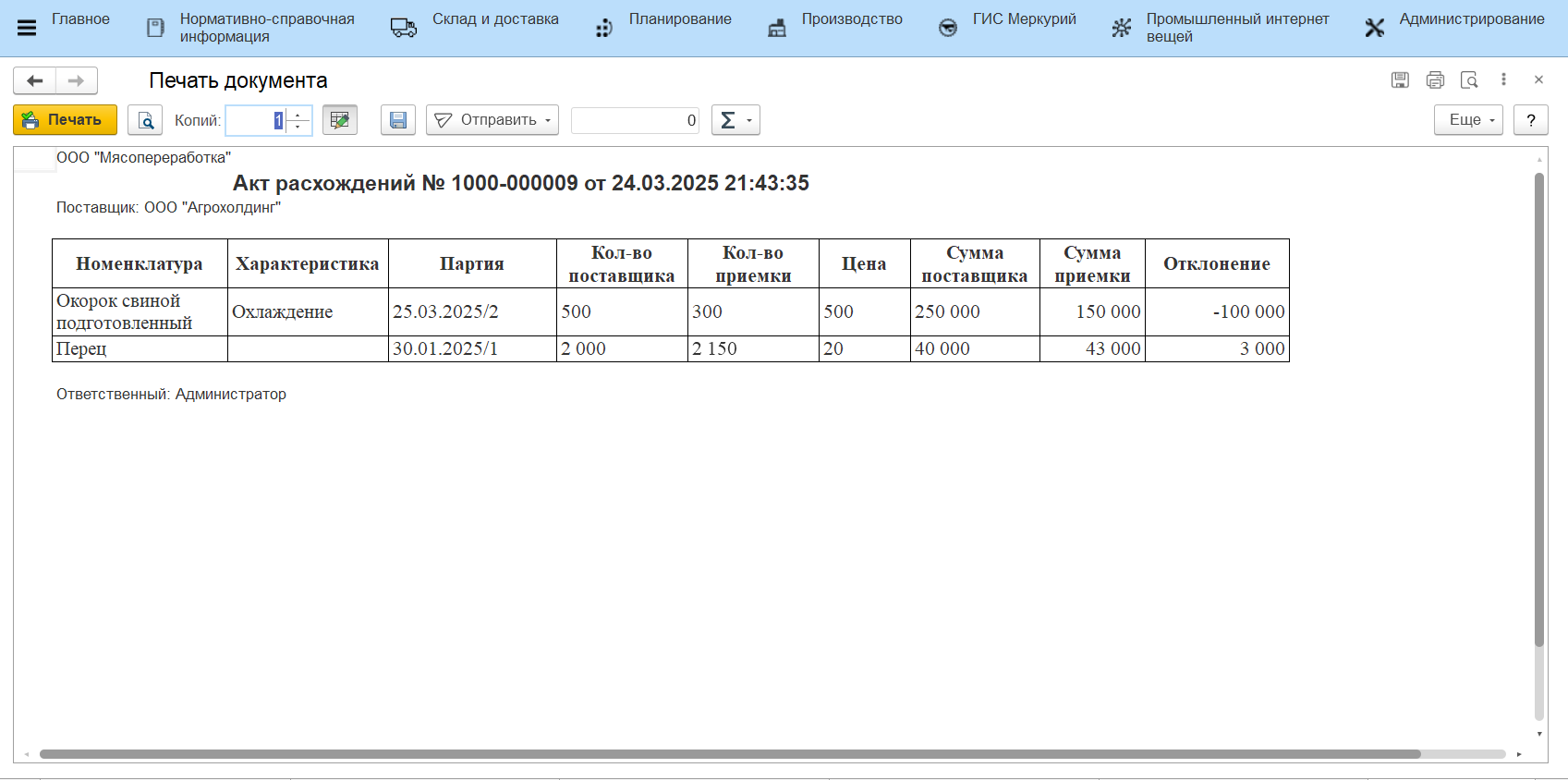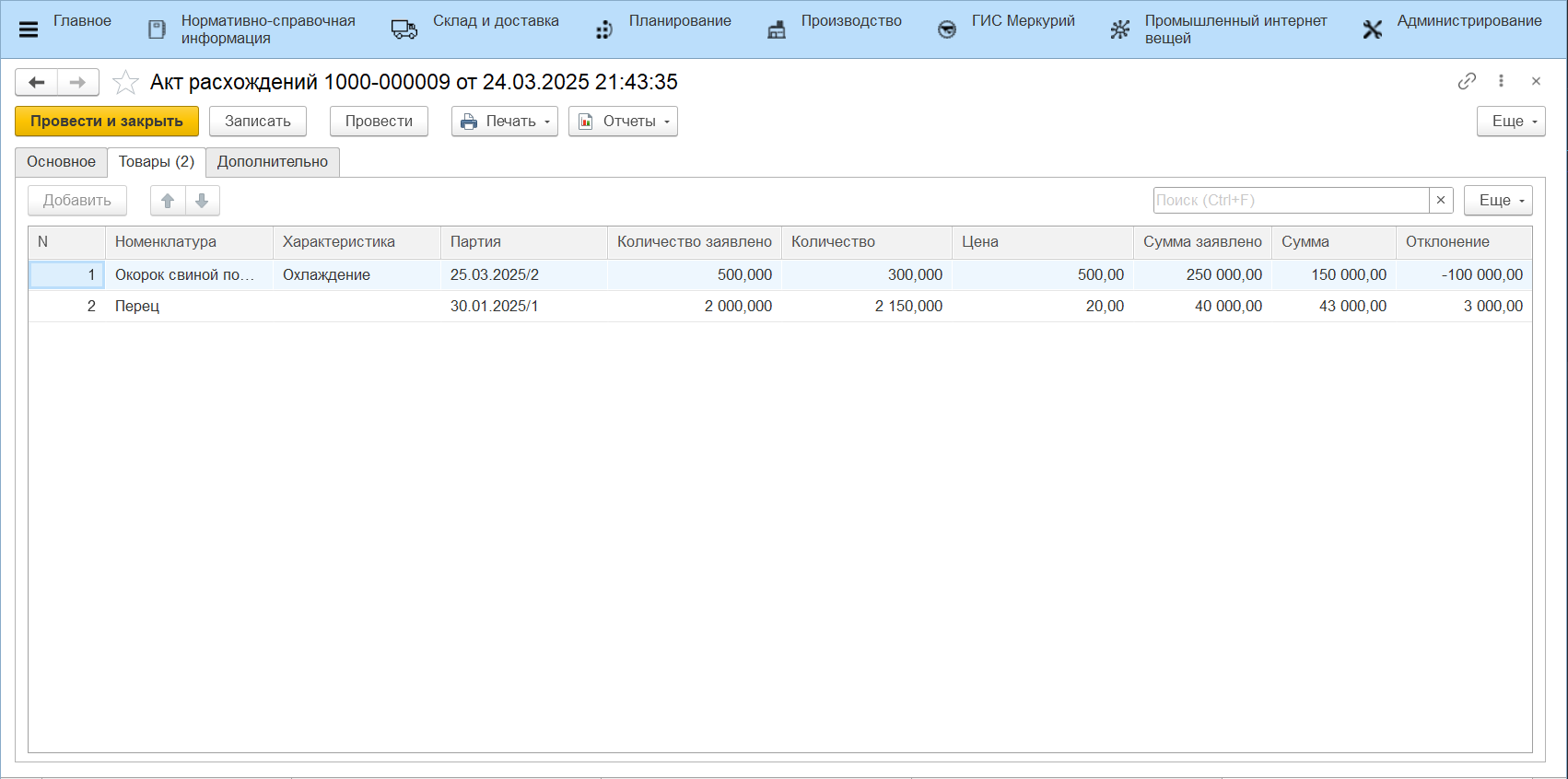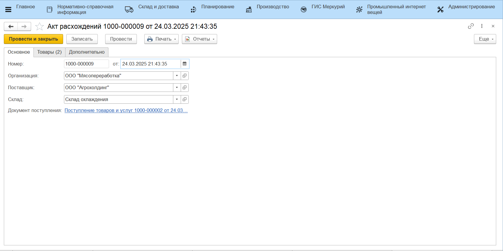Если в результате приемки по накладным выявлены расхождения между заявленными суммами и фактическими, то система предлагает создать документ Акт расхождений. Этот документ позволяет выявить и зафиксировать несоответствия, что является важным шагом в процессе контроля качества поставок и финансового учета.