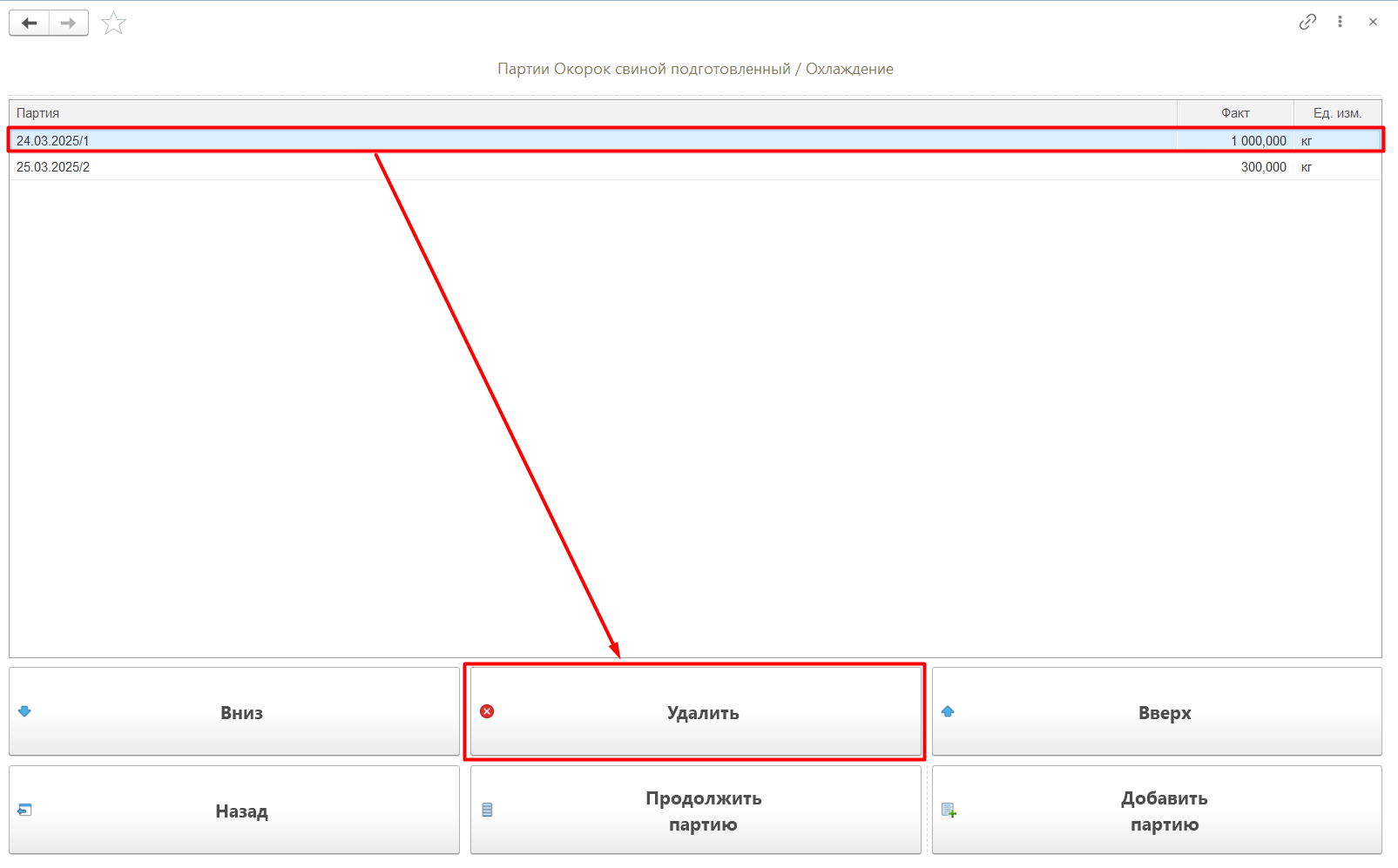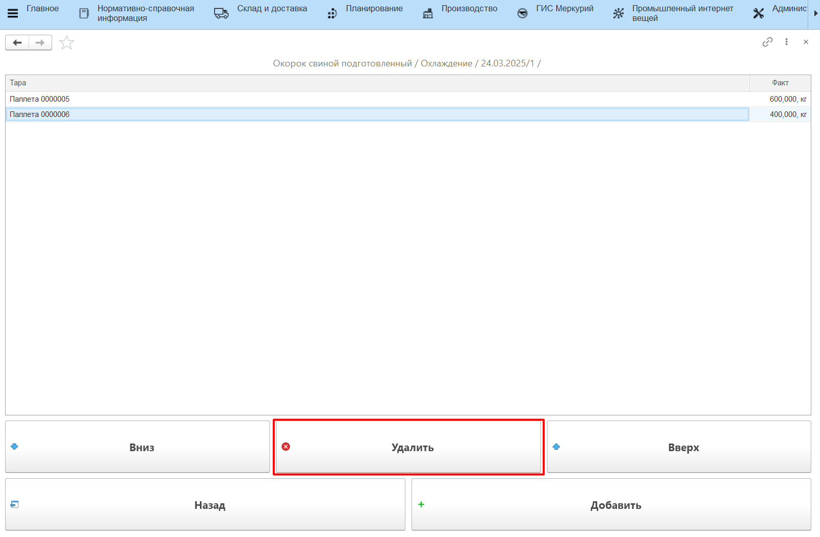 На форме списка паллет можно удалить строку с паллетой, если она неверная: