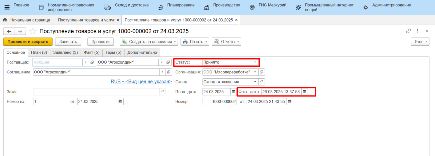 Для возврата на форму документа планового поступления нужно нажать кнопку "Назад". Результат приемки будет видно на форме: