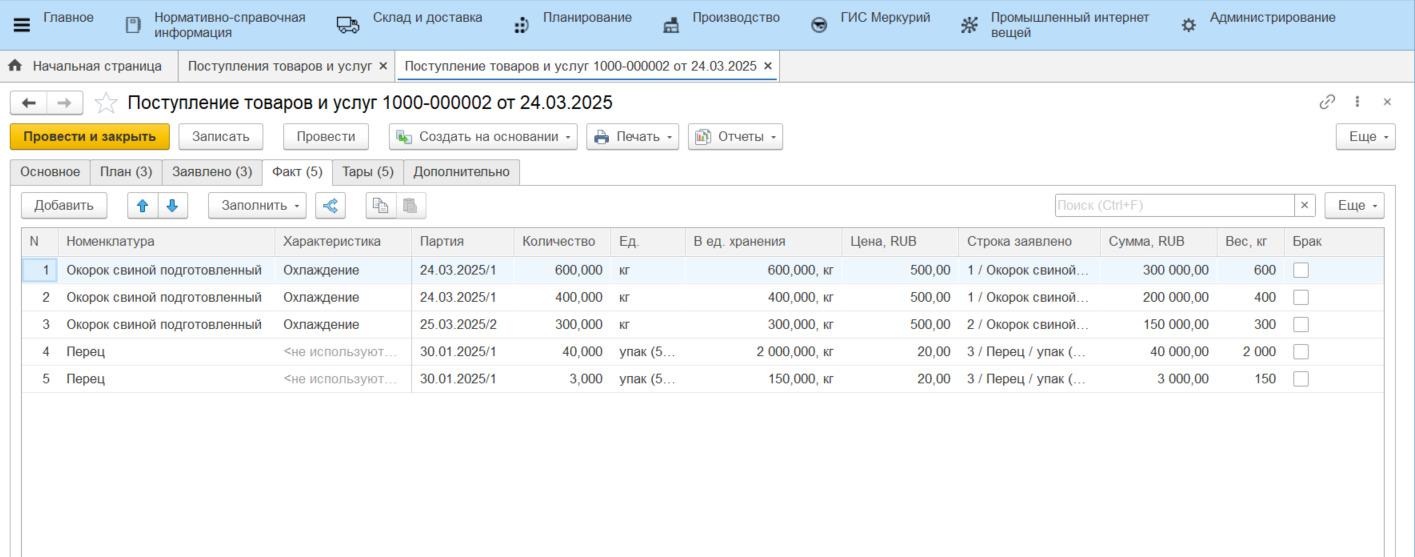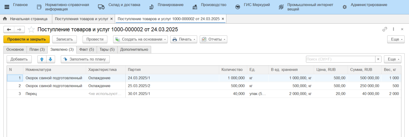 - Ввести заявленное поставщиком количество принимаемой номенклатуры в указанной в плане единице измерения (кг, шт, упаковки и тд), срок годности в днях, дату изготовления и номер партии.