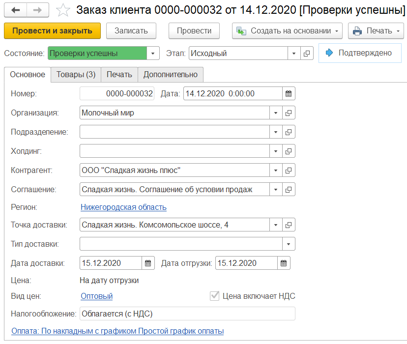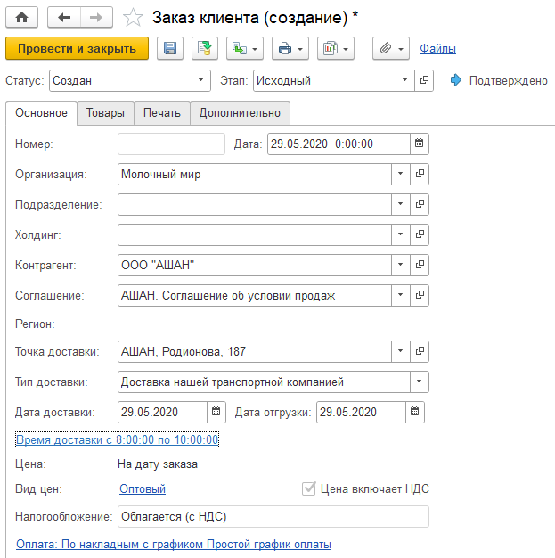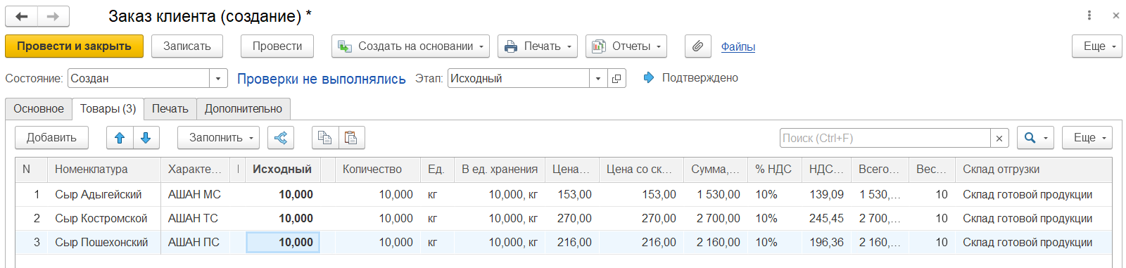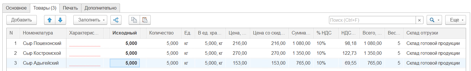 Список заказываемой номенклатуры. Заполняется номенклатура, её характеристика, количество, упаковка, цены рассчитываются автоматически на основании соглашения об условиях продаж, из точки доставки автоматически устанавливается склад отгрузки.