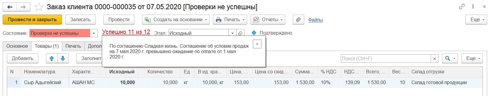 Проверка по количеству дней отсрочки платежа не пройдет, потому что по соглашению "Сладкая жизнь. Соглашение об условии продаж" на дату заказа превышено ожидание по оплате. Об этом будет написано в сообщении при нажатии на гиперссылку "Успешно 11 из 12" (12 - количество включенных проверок, 11 - количество пройденных проверок).