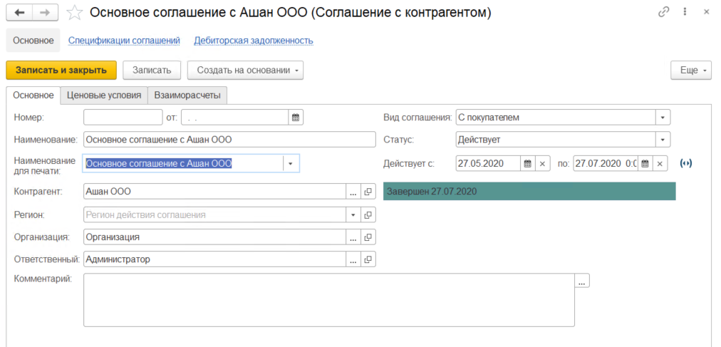 Создаем соглашение для контрагента Ашан, регион - Нижегородская область, организация - Молочный Мир, статус - действует, даты: 27.05.2020 - 27.07.2020, вид соглашения - с покупателем