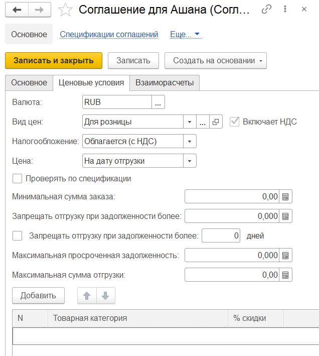 Для соглашений с видом "С покупателем" на вкладке "Ценовые условия" дополнительно отображаются и заполняются поля: