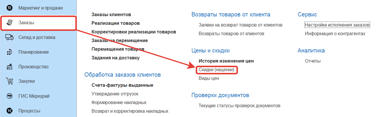 Документы "Скидки (наценки)" предназначены для описания скидок/наценок применяемых к Соглашениям с контрагентами. Они расположены в разделе "Заказы" в подсистеме "Цены и скидки".