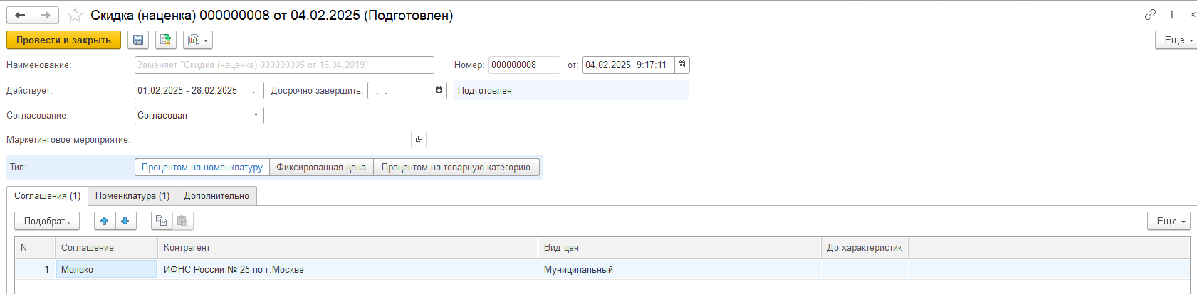 - Тип: процентом на номенклатуру, фиксированная цена, процентом на товарную категорию