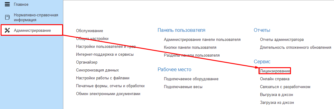 Для получения лицензии необходимо перейти в раздел "Администрирование" и выбрать "Лицензирование":