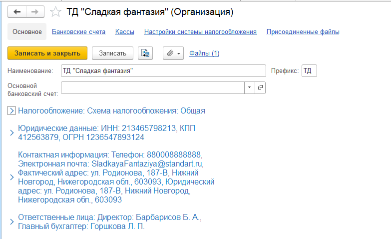 Выбирается система налогообложения : Общая или Упрощенная, для упрощенной указывается ставка НДС, которая будет применяться в документах системы