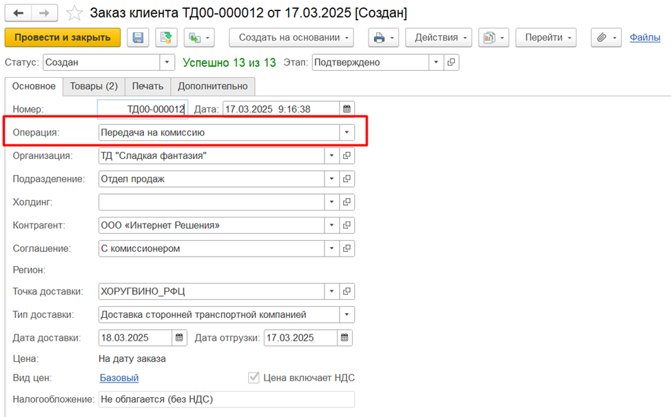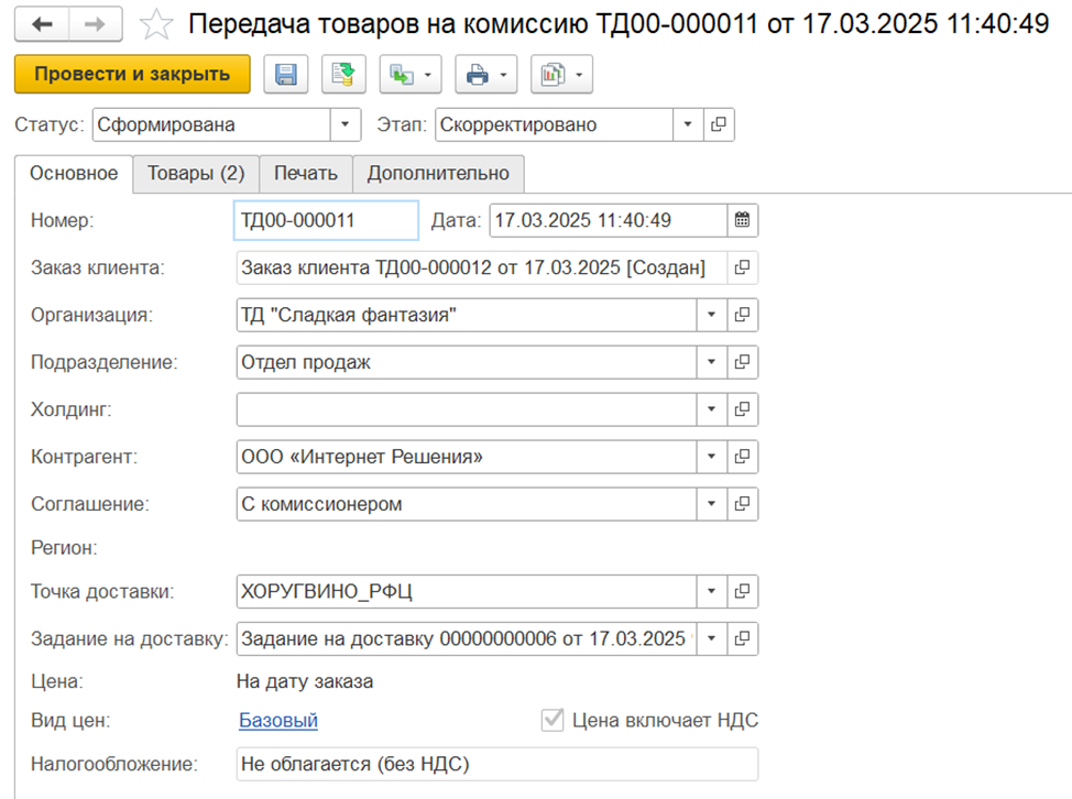 Документ "Заказ клиента с операцией Передача на комиссию" отражает потребность комиссионера на поставку ему товаров. Документы расположены в разделе "Заказы".