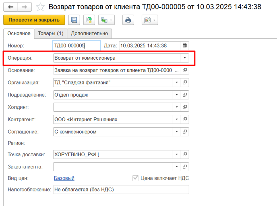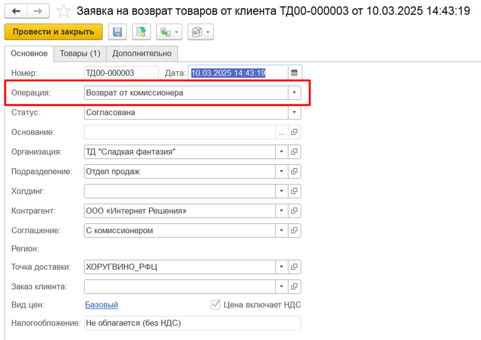 Для создания заявки на возврат товаров от комиссионера используется документ «Заявка на возврат товаров от клиента» с операцией Возврат от комиссионера. Документ уменьшает количество товаров, находящихся у комиссионера