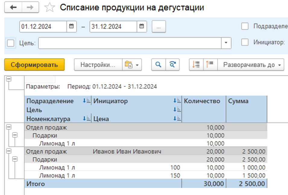 Отчет «Списание продукции на дегустации» позволяет получать информацию о списаниях на внутреннее потребление за выбранный период. Отчет показывает, кем и на какие цели была использована номенклатура