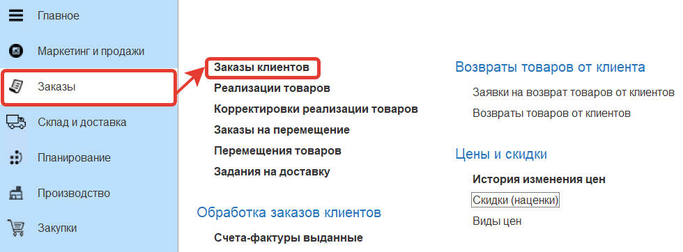Документ "Заказ клиента" отражает потребность клиента на поставку ему товаров. Документы расположены в разделе "Заказы".