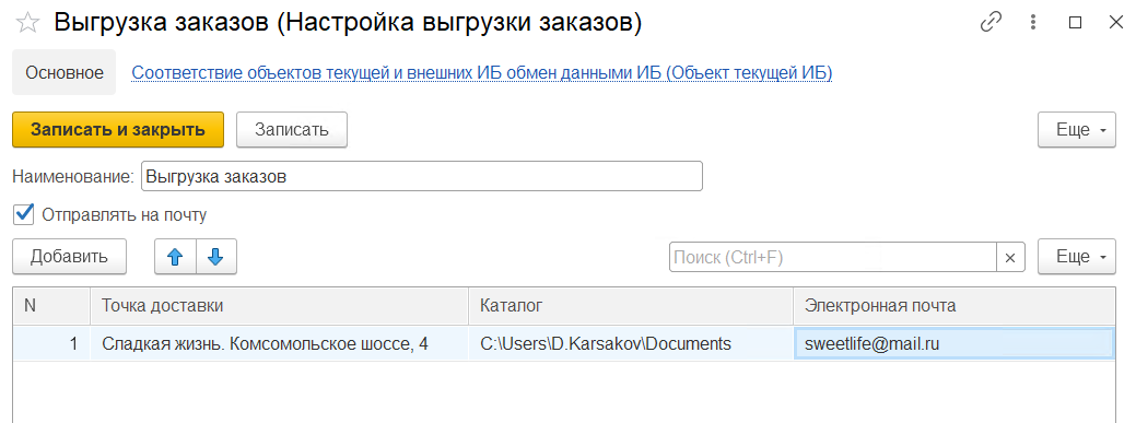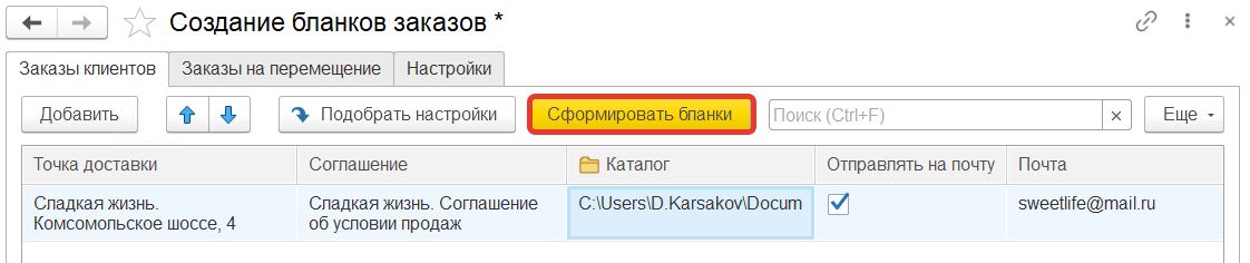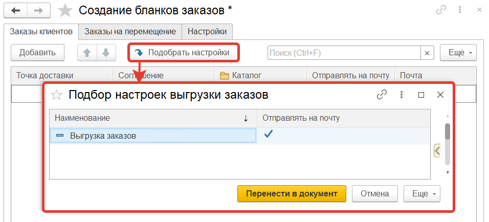 На вкладке "Заказы клиентов" по кнопке "Подобрать настройки" выбираются настройки выгрузки заказов. По настройкам заполняются точка доставки, соглашение с контрагентом, каталог куда будет выгружен бланк, признак отправки на почту и почтовый адрес.. Так же эти данные могут быть заполнены вручную.