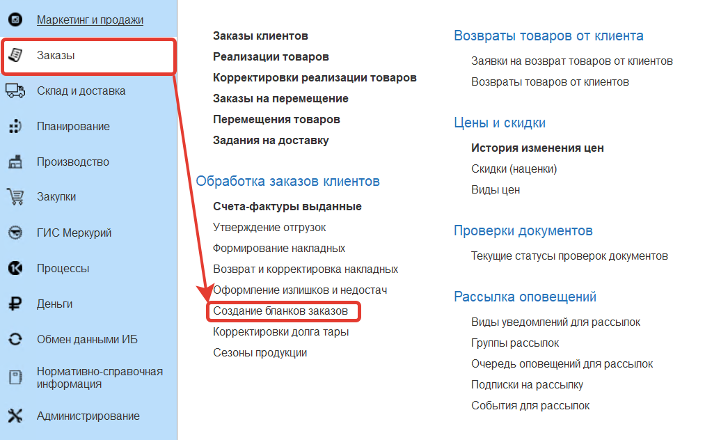 Бланки для заказов создаются в АРМе "Создание бланков заказов", который расположен в разделе "Заказы".