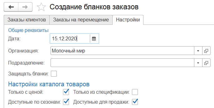 На вкладке "Настройки" заполняются дата (планируемая дата доставки заказа), организация, подразделение. Признак защищать бланки позволяет защитить от редактирования все колонки таблицы товаров выгружаемого бланка кроме количества и даты доставки.