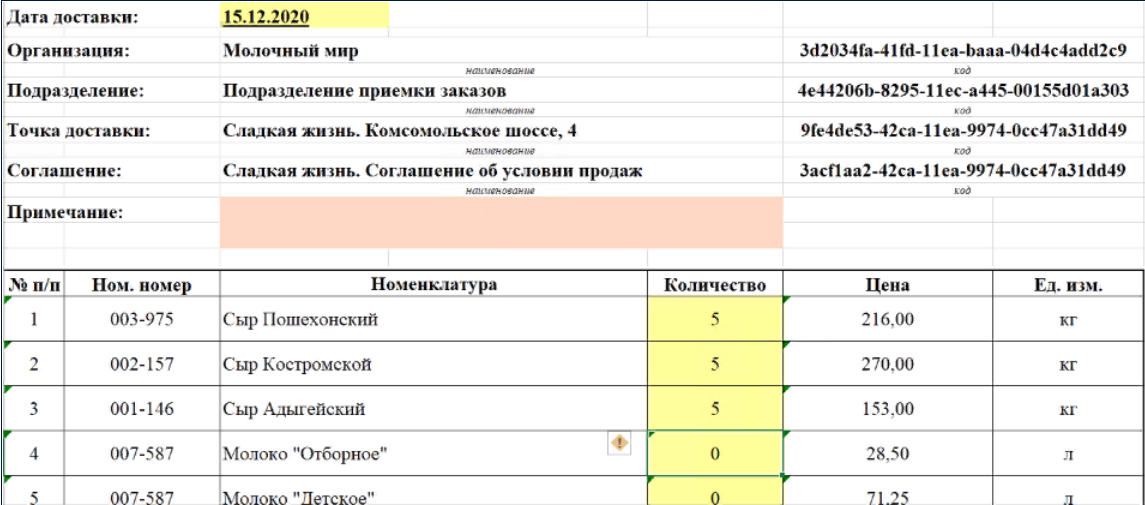 При загрузке бланка с той же датой отгрузки, точкой доставки и соглашением повторно данные в старом заказе будут изменены на загружаемые.