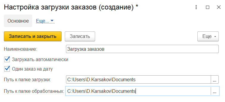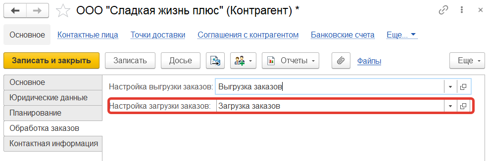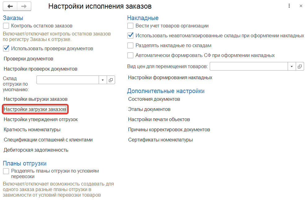 Для этого нужно заполнить "Настройки загрузки заказов", которые расположены в разделе Заказы в подсистеме "Сервис" - "Настройки исполнения заказов"