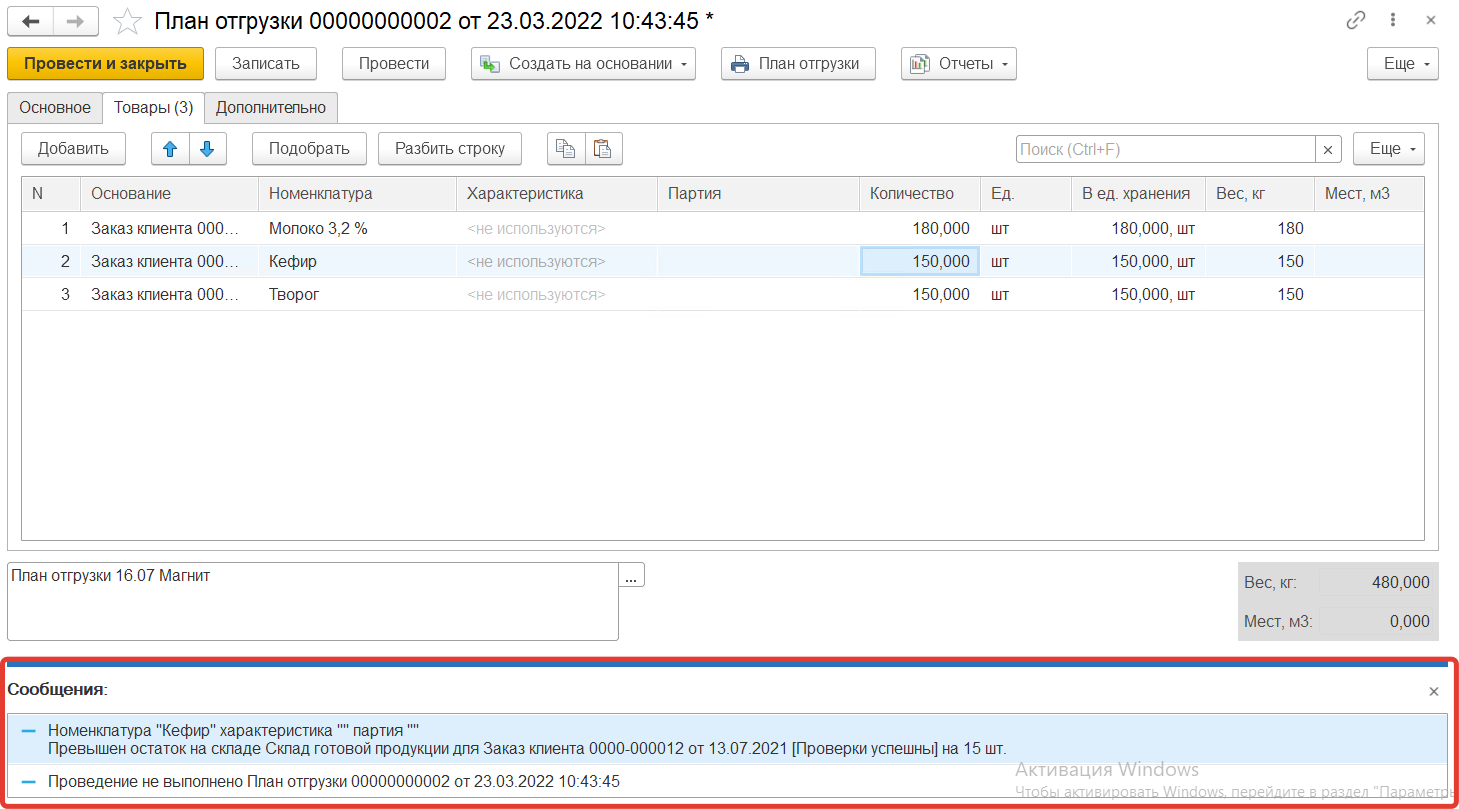 При этом количество в плане отгрузки нельзя сделать больше чем в заказе: