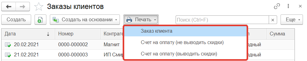 Для документа "Заказ клиента" используются печатные формы: "Заказ клиента", "Счет на оплату (выводить скидки)", "Счет на оплату (не выводить скидки)".