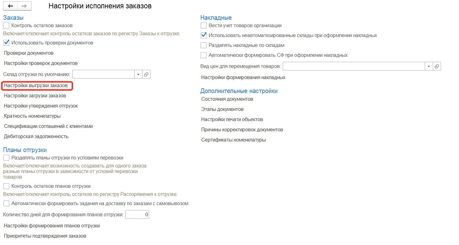 Для выгрузки бланков создаются "Настройки выгрузки заказов", которые расположены в разделе Заказы в подсистеме "Сервис" - "Настройки исполнения заказов"