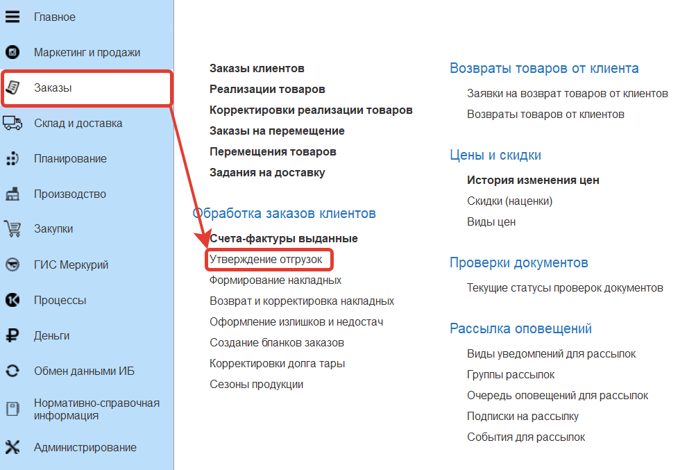 АРМ "Утверждение отгрузок" расположен в разделе "Заказы" в подсистеме "Обработка заказов клиентов".