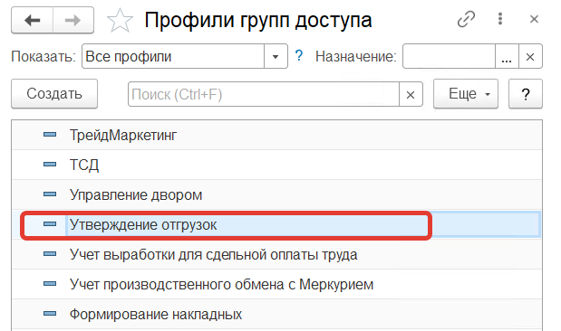 Для пользователей, которые занимаются Утверждением отгрузок в системе создан поставляемый профиль доступа "Утверждение отгрузок".