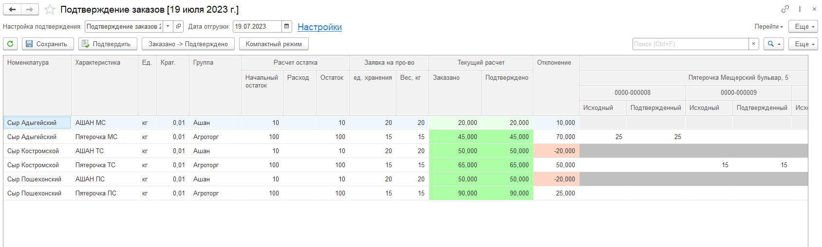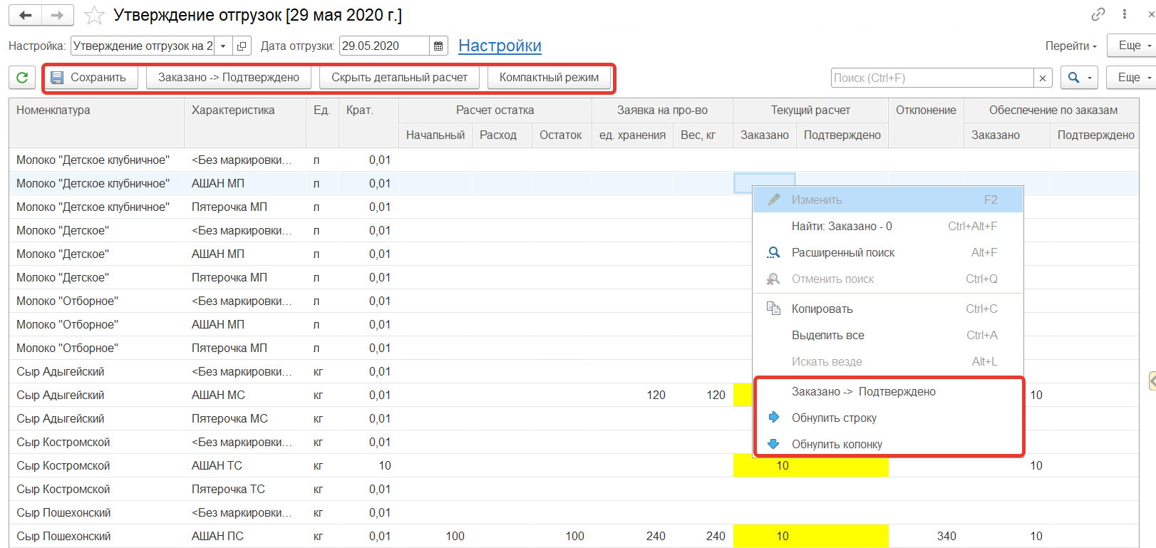 - Включить/Выключить компактный режим - скрывает/отображает колонки кратность, единицы измерения, заказано для групп планирования отгрузок