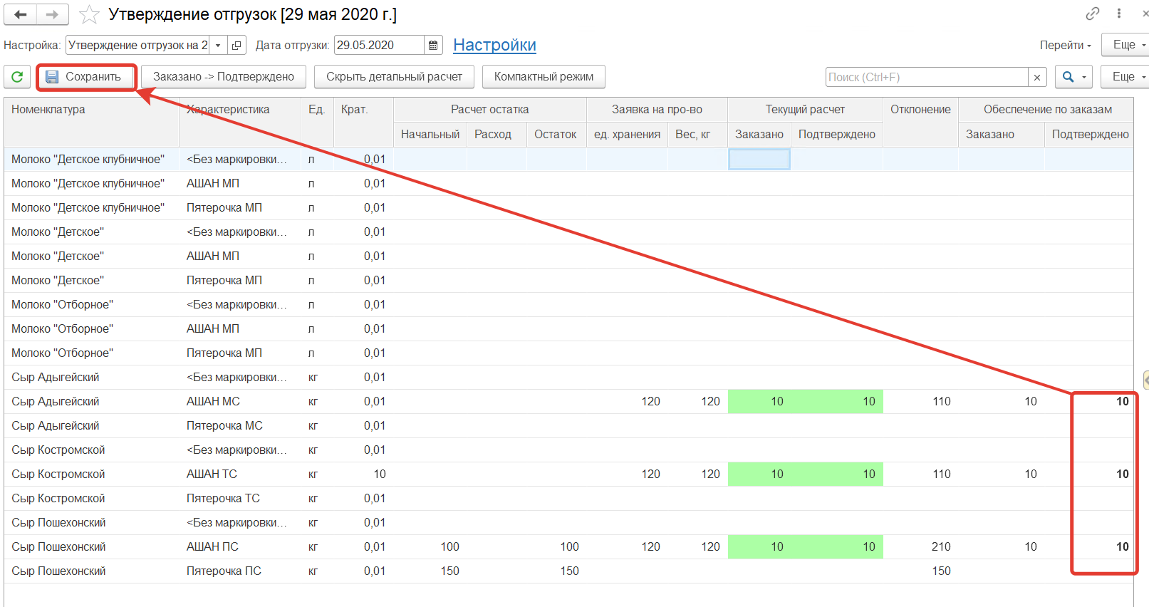 Вносим подтвержденное количество товаров и нажимаем кнопку "Сохранить" - тем самым утверждаем количество отгружаемых товаров по группе планирования отгрузок, эти данные в дальнейшем используются при подтверждении заказов. Сохранять можно, только если в настройках указан один склад отгрузки