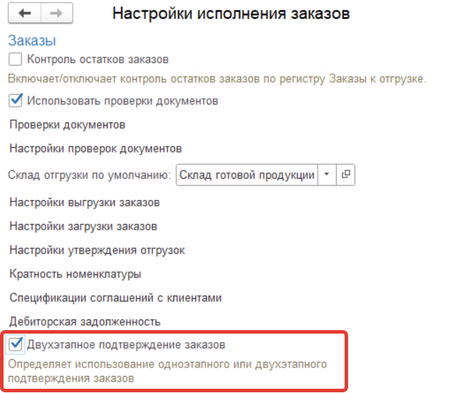 Для возможности работы с АРМом "Утверждение отгрузок" необходимо установить флаг "Двухэтапное подтверждение заказов".
