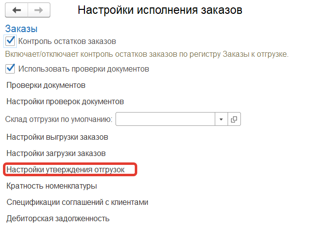 Утверждение отгрузок происходит по "Настройкам утверждения отгрузок", которые заполняются в разделе "Заказы" в подсистеме "Сервис" - Настройки исполнения заказов".