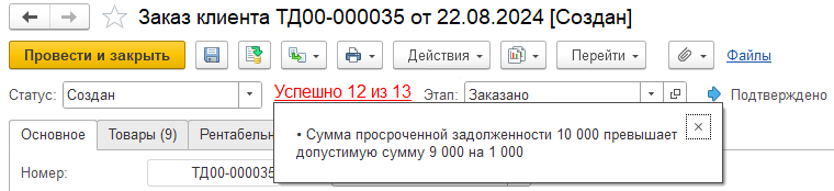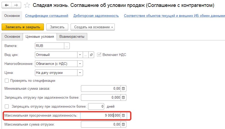 В соглашении с покупателем на вкладке "Ценовые условия" указывается максимальная просроченная задолженность