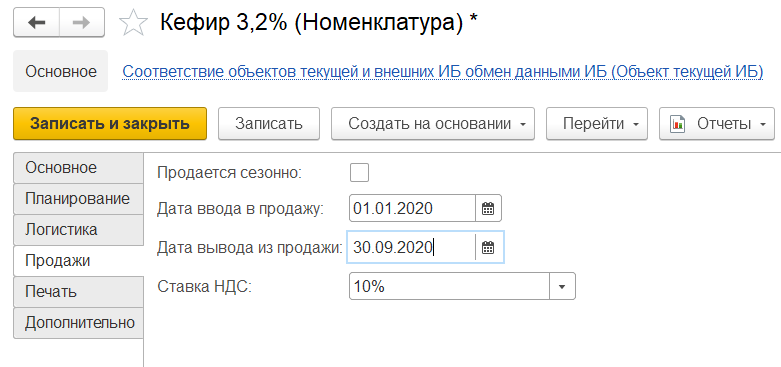 Переходим к номенклатуре "Кефир 3,2%" и устанавливаем для неё на вкладке "Продажи" дату ввода в продажу - 01.01.2020 и дату вывода из продаж - 30.09.2020