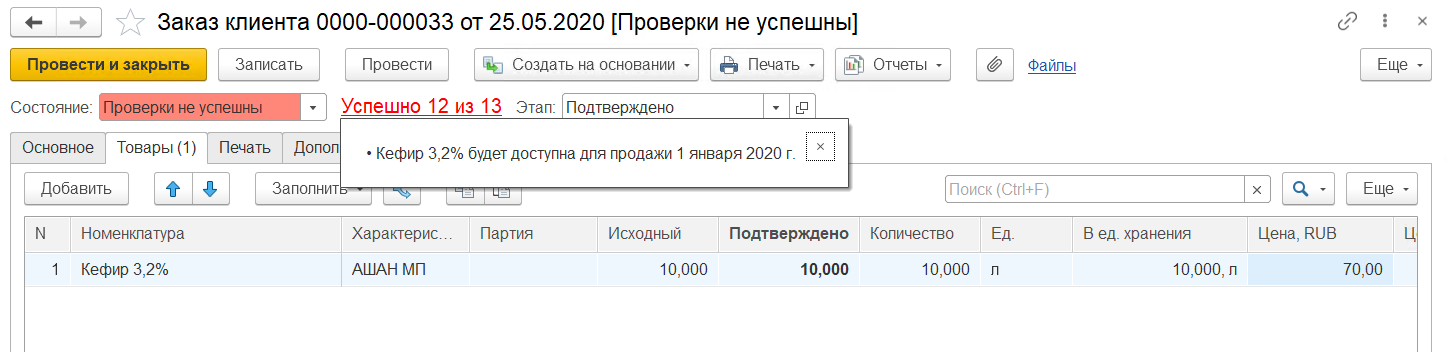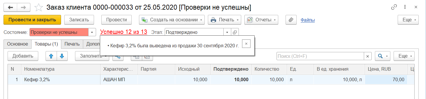 Нажимаем кнопку "Провести", установится статус заказа - Проверки не успешны.