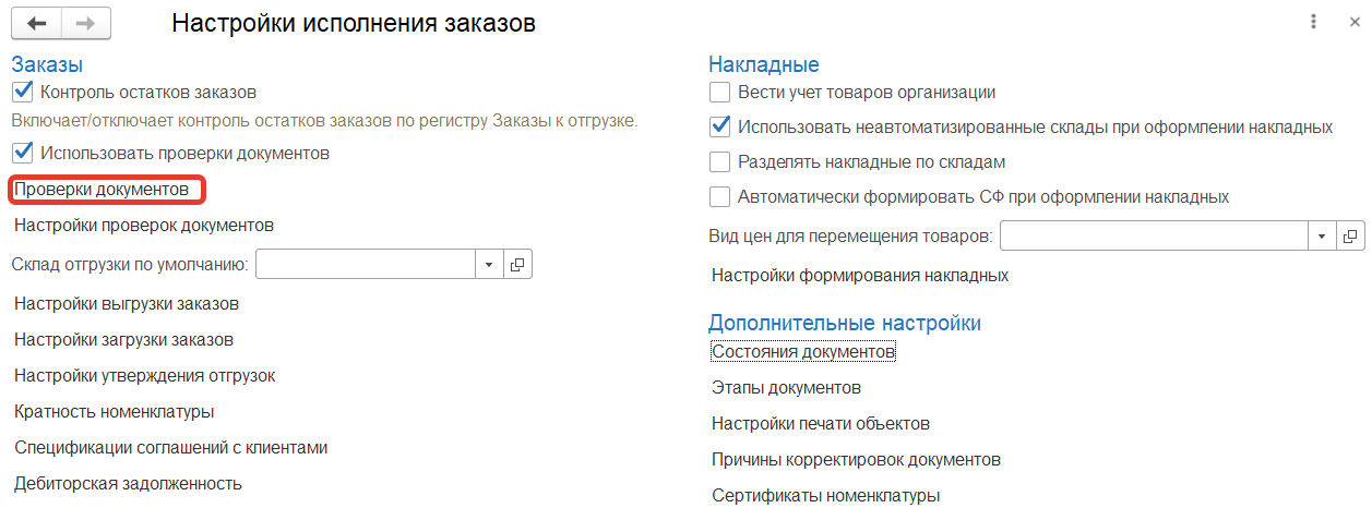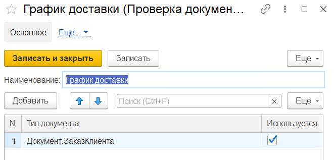 В разделе "Заказы" в "Настройках исполнения заказов" в "Проверках документов" устанавливаем проверку - "График доставки" для документов Заказ клиента.
