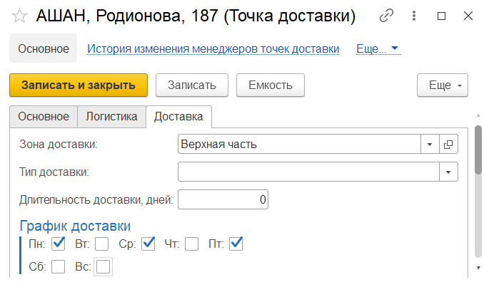 Переходим к точке доставки "АШАН, Родионова, 187" и на вкладке "Доставка" настраиваем график доставки: