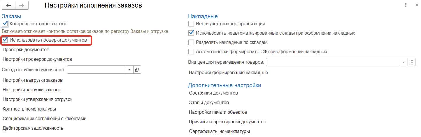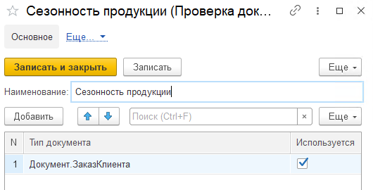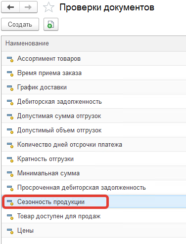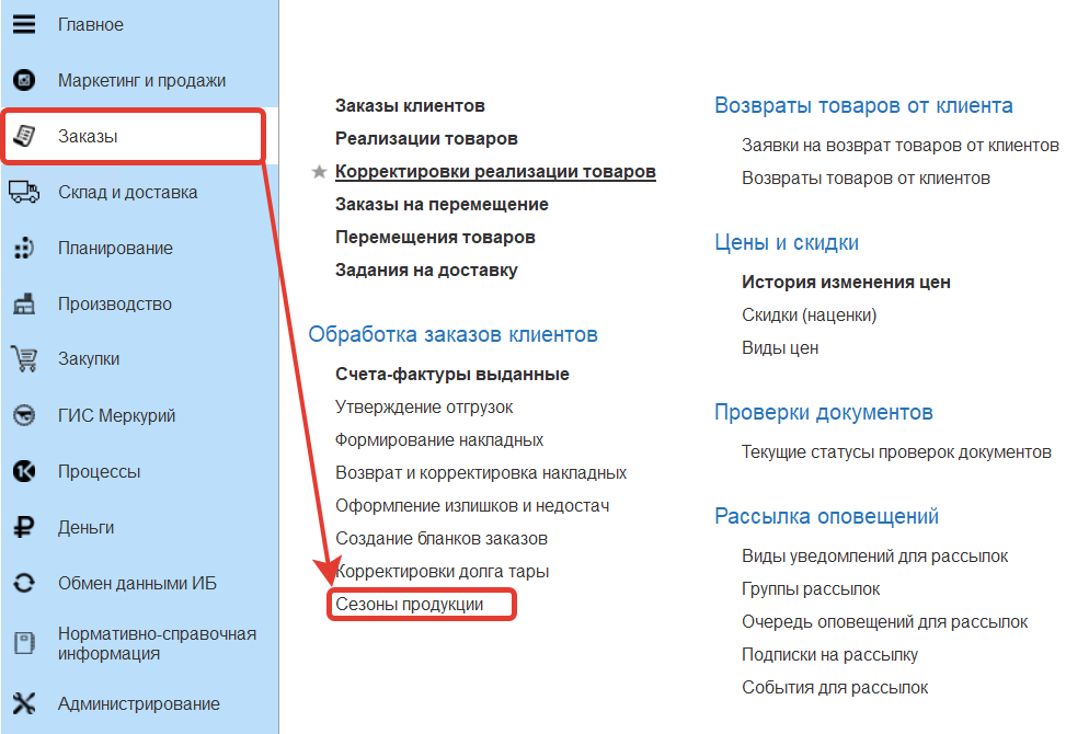 В разделе "Заказы" в "Настройках исполнения заказов" в "Проверках документов" устанавливаем проверку - "Сезонность продукции" для документов Заказ клиента.