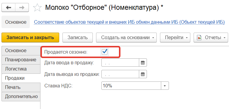 Переходим к номенклатуре "Молоко Отборное" и устанавливаем для неё на вкладке "Продажи" признак "Продается сезонно"