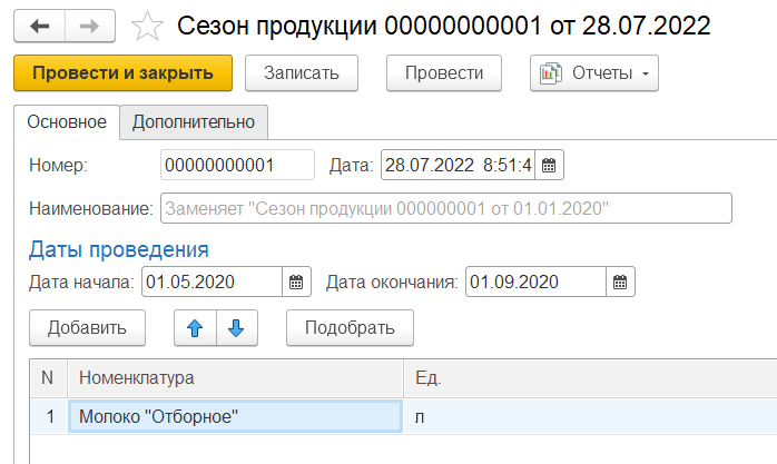 Создаем документ "Сезон продукции" для номенклатуры "Молоко "Отборное"", даты проведения сезона: 01.05.2020 - 01.09.2020