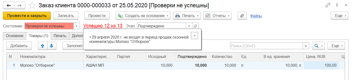 Проверка по сезонности продукции не пройдет, так как сезон на номенклатуру "Молоко "Отборное"" 29.04.2020 ещё не начался. Об этом будет написано в сообщении при нажатии на гиперссылку "Успешно 11 из 12" (12 - количество включенных проверок, 11 - количество пройденных проверок).