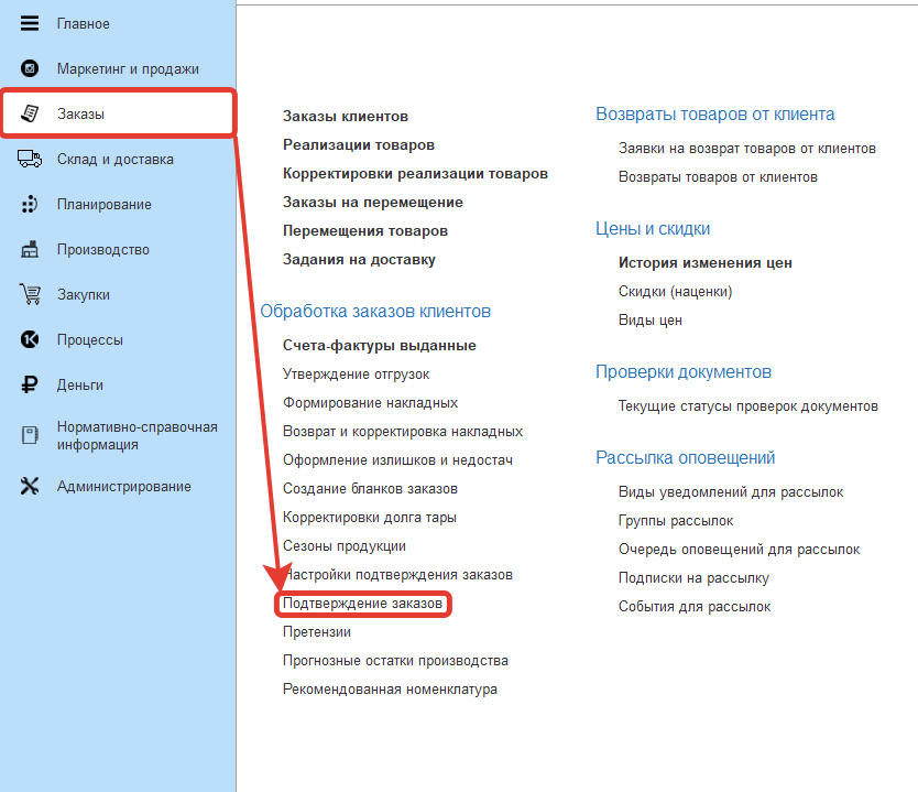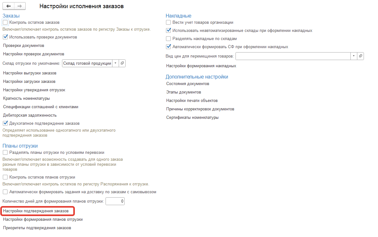 Подтверждение заказов происходит по "Настройки подтверждения заказов", которые заполняются в разделе "Заказы" в подсистеме "Сервис" - "Настройки исполнения заказов".